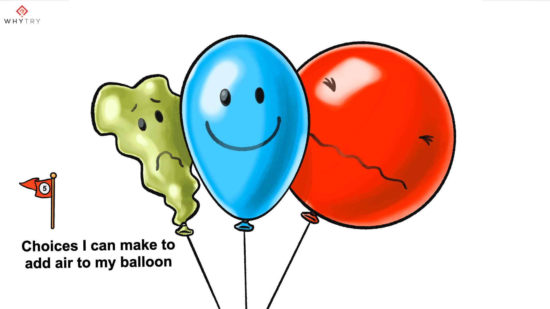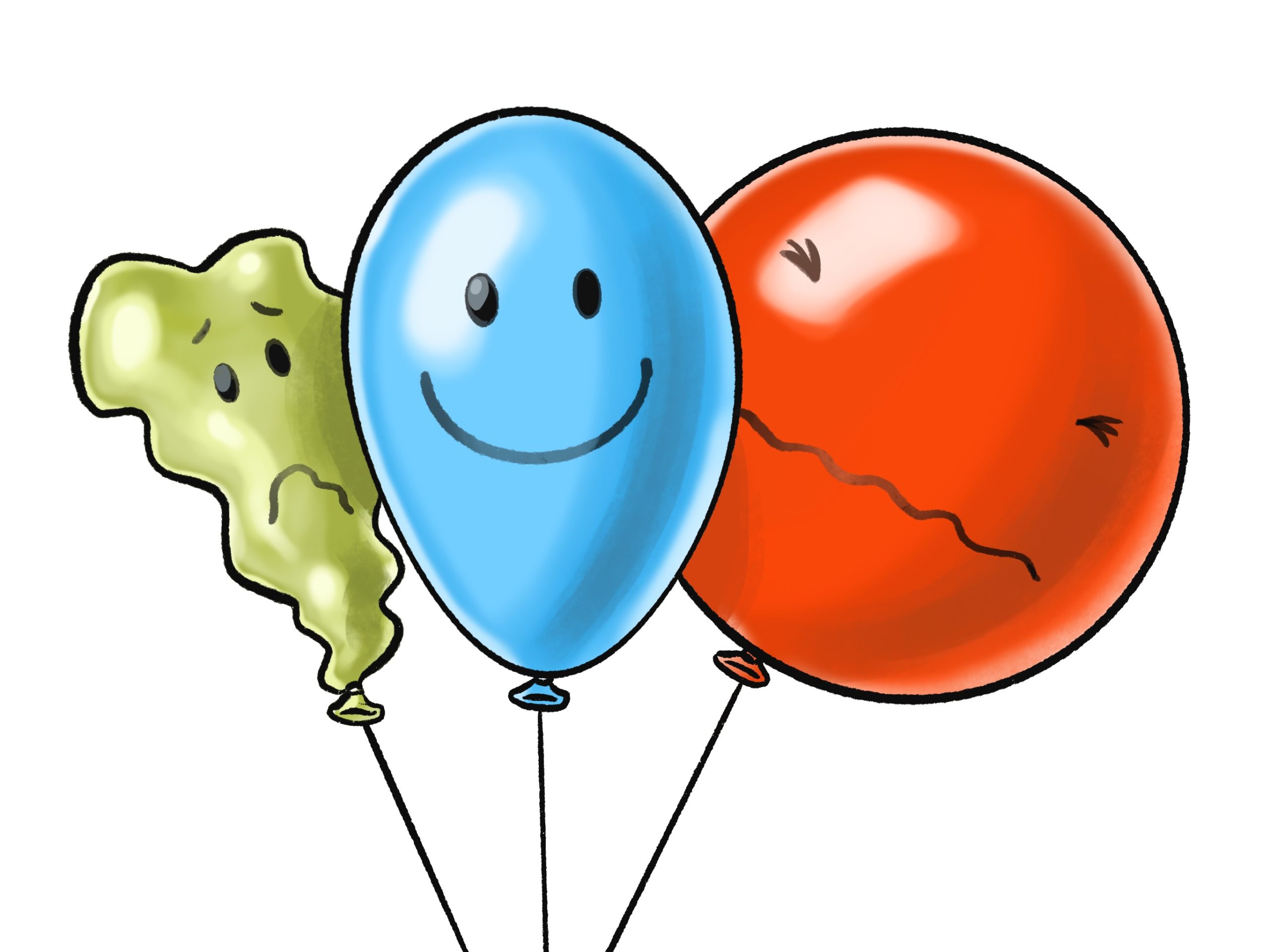 Say: “Sometimes during our day, there are things that overinflate our balloon and cause us to be angry or upset, and things that let too much air out of our balloon and cause us to be underinflated or sad. The that happens, there are things we can do to add air or let the air out to get us back to where we want to be, like the middle balloon.”